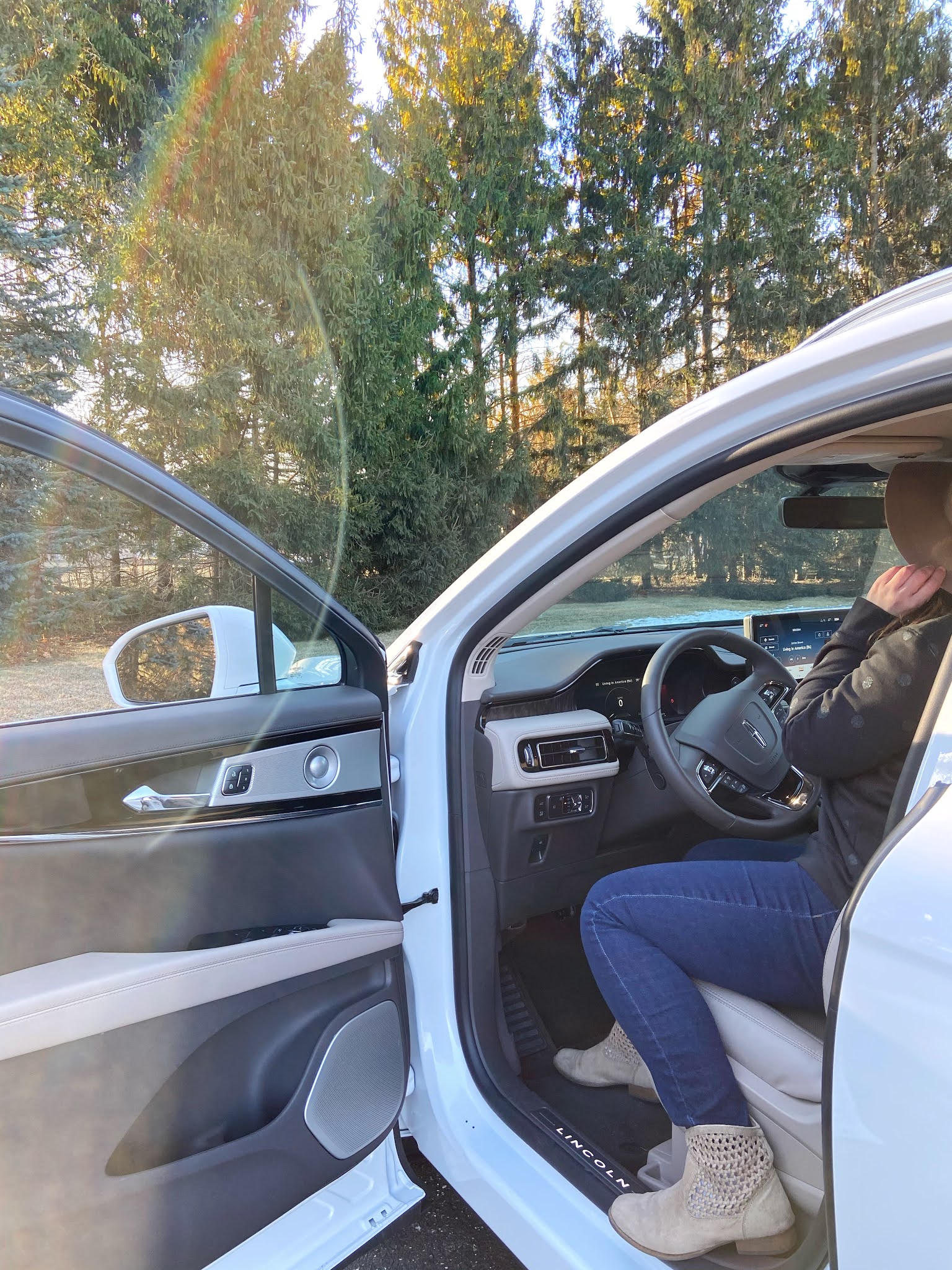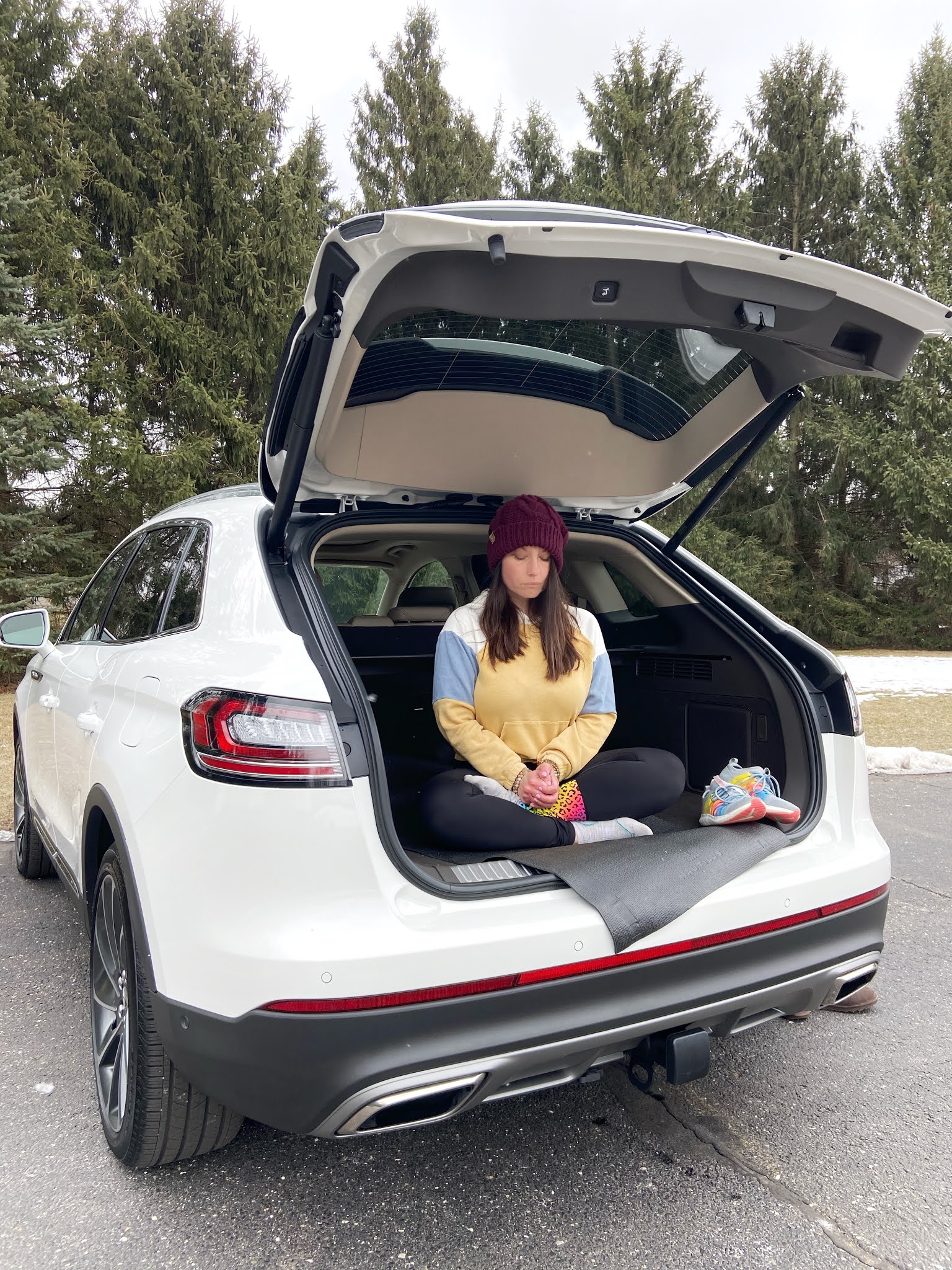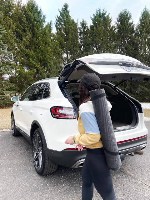 I wanted to fully immerse myself in everything the 2021 Lincoln Nautilus has to offer. So, I turned on the heated seats with active motion massage and headed out to my favorite woodland spot. Once parked I laid my yoga mat in the back of the Nautilus, and turned on the Calm app.