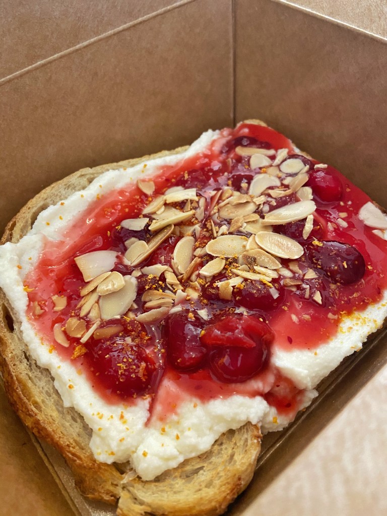 toasted sourdough bread topped with ricotta, seasonal fruit compote, toasted almonds and orange zest.
