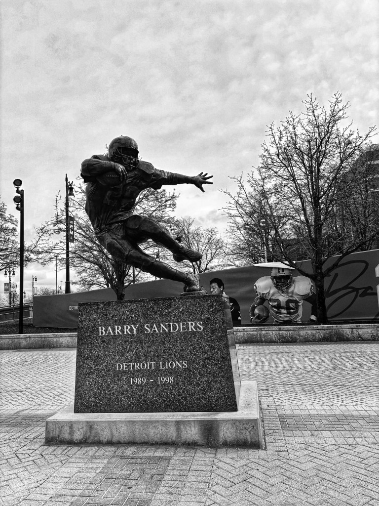 Our final stop of the weekend was at Ford Field, home of the Detroit Lions. Right outside the stadium stands the iconic Barry Sanders statue, paying tribute to one of the greatest running backs in NFL history. The statue captures Sanders in mid-run, showcasing his dynamic playing style that made him a legend in Detroit and beyond.