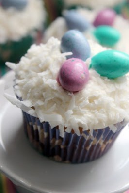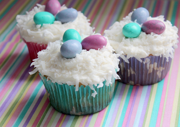 4. When cupcakes are completely cooled, frost, sprinkle with coconut and add three cococnut Easter M&M’s if desired.
