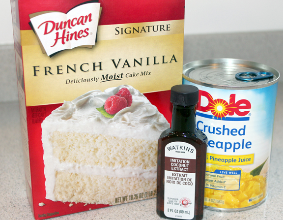 1. In a bowl, mix together canned pineapple, cake mix and coconut extract. Stir until batter is smooth.