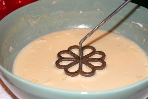 5. Dip hot iron into batter, almost to the top, but not over the top of iron.