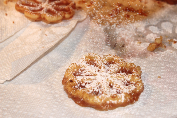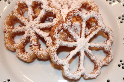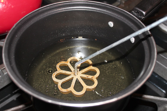 7. Place in hot oil. When rosette holds its shape remove the iron and allow to brown, then turn over to brown opposite side.