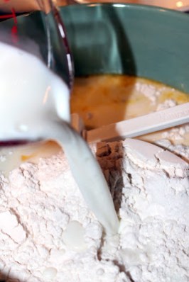 2. Add ½ cup milk and all of the flour. Then add remaining ½ cup milk, stirring (do not beat).