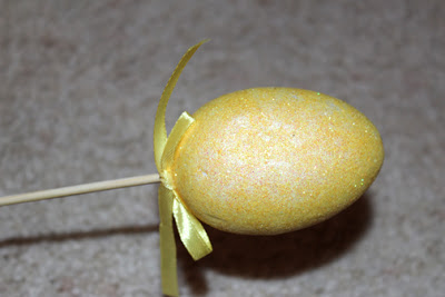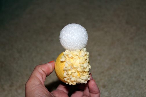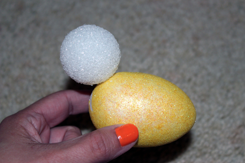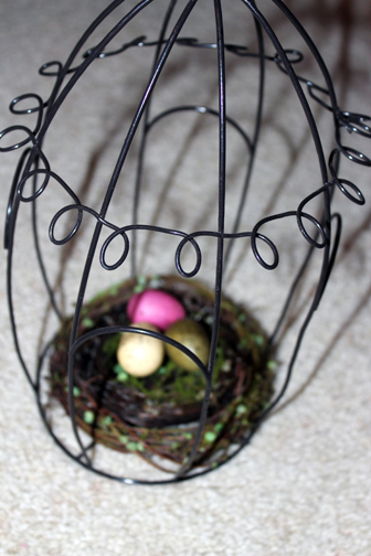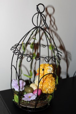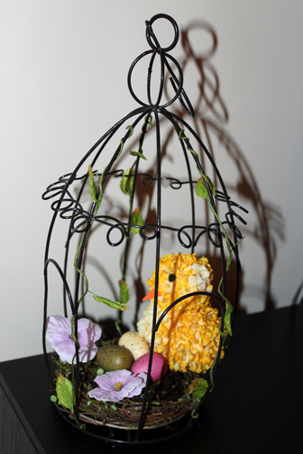 This year I wanted to go for a more whimsical approach when it came to my Easter décor. I attached a small styrofoam ball to a styrofoam egg, and hot glued tiny silk flowers onto the “chick shape” to resemble fluffy feathers. I added eyes and an orange foam beak. The chick was placed into a birdcage that I had nestled two wreaths and three eggs in. You can make multiple chicks to create an adorable centerpiece or fasten them to an Easter basket for a touch of playfulness.