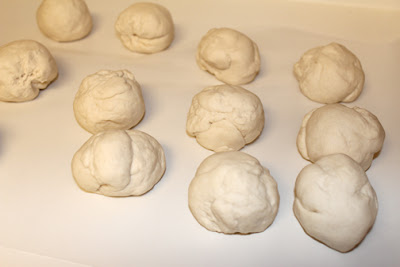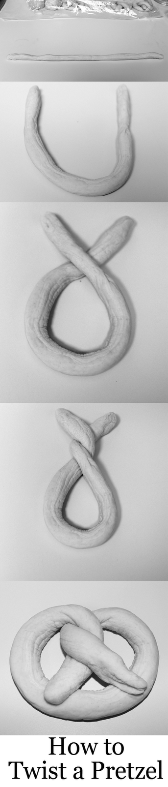 • Punch dough down; divide into 13 portions. Roll into an 18 inch rope (you will need to push down extremely hard to get the dough to stretch); twist into a pretzel shape (the easiest way is how I show below)