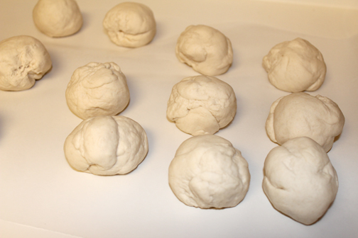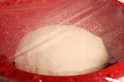• Turn dough onto a floured surface; knead until smooth and elastic (this took me about 20 minutes). Place dough in a greased bowl, turning once to grease the top. Cover with plastic wrap and let rise until doubles in size (this took about 1 hour).
