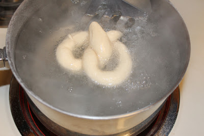 • In a large saucepan, bring water and baking soda to a boil. Place pretzels into the boiling water, one at a time, for 30 seconds (the pretzel should float). Place on a paper towel and pat semi dry.