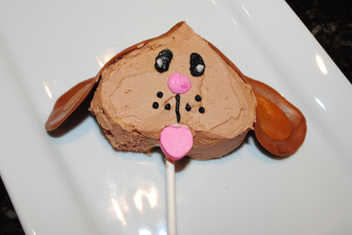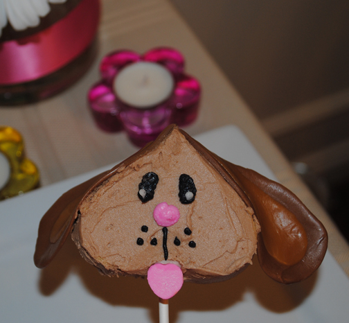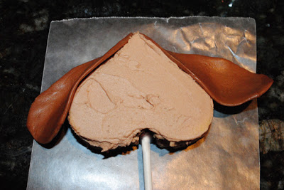 To make the ears: Place Tootsie Rolls in the microwave for five seconds (this makes them pliable). Form each Tootsie Roll into a floppy ear shape. Frost the ear and attach it to the sides of the heart. Note: I did some ears just using the Tootsie Roll for some of the others I put caramel in the center to give the ear some dimension.
