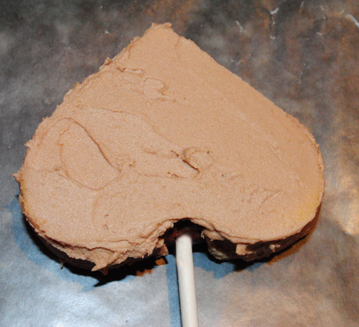 Once you remove the upside down heart shape from the freezer frost the top and sides with chocolate frosting.