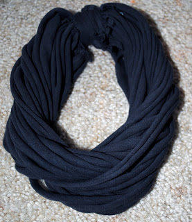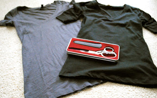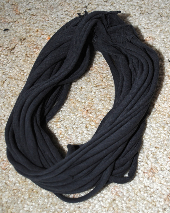 You will need one t-shirt and fabric scissors. I made two different necklaces thus the two shirts. My shirts are from Old Navy and they cost about $5 a piece. You want to get fitted tees.