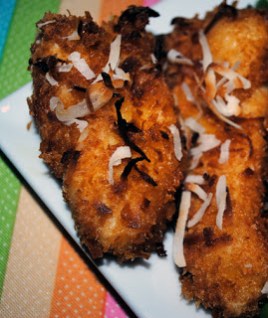 Dip the chicken the egg, then into the coconut mixture.