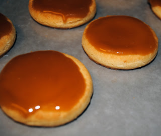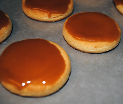 • Spread some caramel on the tops of each of your cookies. This helps the caramel coconut mixture adhere quickly to the cookie.