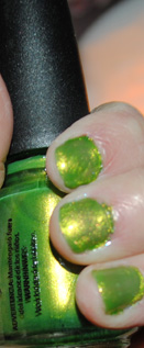 Cha Cha Cha is a shimmer bright green… heavy on the yellow shimmer. The color reminds me of the green on a pineapple or a sour apple drink.