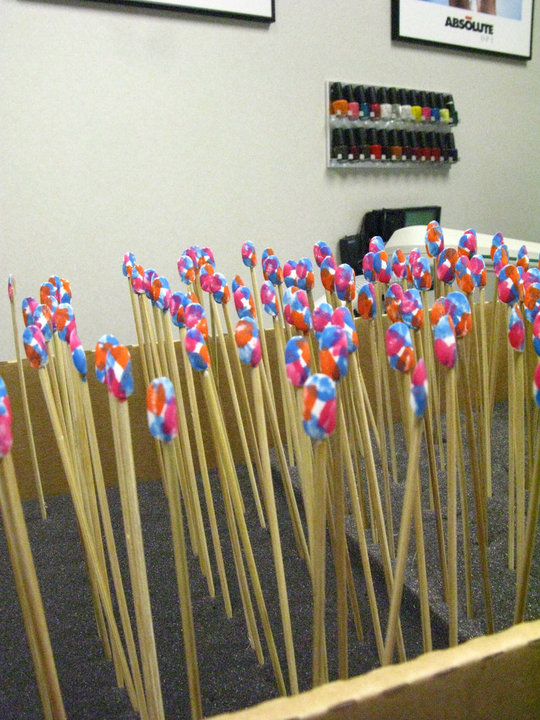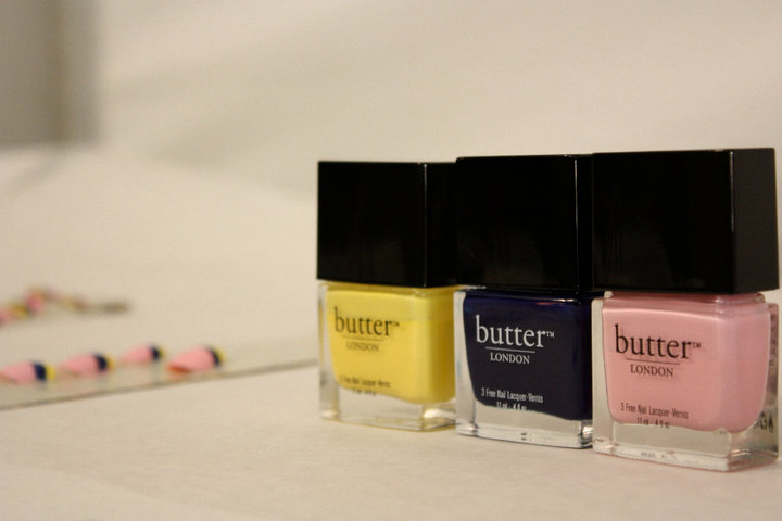 {Butter London created the racing stripes on the nails using: a pepto shade pink on the entire nail and then a stripe of royal navy underneath a stripe of yellow cheeky.}