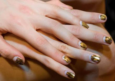 {The nails were painted with a basic clear base coat and then a gold foil was applied by rubbing it straight onto the nail. This gives a dipped gold metallic look.}