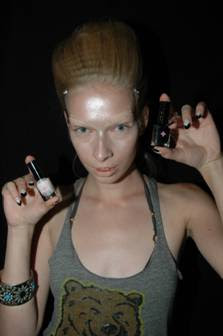 Eyes: On upper lid only use Black Ink Gel Liner heavily , and finish the eyes with a small amount of Beige Shimmer Brick. Add heavy amounts of mascara.